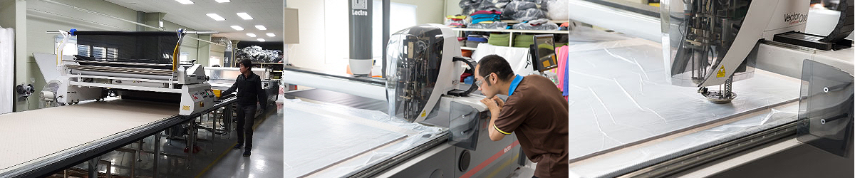 재단 자동재단기를 설치하여 원하는 디자인대로 패턴을 입력하면 많은 양을 정확하고 빠른 재단을 하여 생산성 향상에 이바지하고 있습니다. |